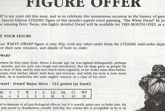 Otra "pequeña" curiosidad histórica sobre la historia de Warhammer para seguir adelante en el día de hoy. Y lo de pequeña no es porque sea una miniatura de un enano,precisamente.Corría el año 1987 y la revista White Dwarf de Games Workshop cumplía 10 años de existencia como tal, con el numero 90 de la misma, por lo que para celebrarlo, los gemelos Perry sacaron una figura de la "mascota" de la revista: El propio Enano Blanco, basado en la ilustración de John Sibbick. No es la primera figura de el, ya que hay una anterior de 1983-1984, pero esta es la primera que viene con reglas (Para WFB 1ª o 2ª ed, ahora no lo tengo del todo claro)y coste de puntos, y que si no estoy equivocado,es la primera del Enano Blanco en metal que tiene lengüeta y peana de plástico independiente, ya que la anterior que hubo era de una sola pieza de metal.