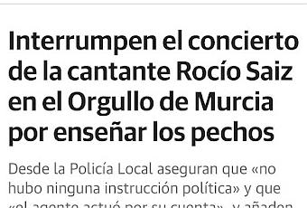 Rocío Saiz, con el pecho descubierto en una actuación.La Fiscalía de Murcia, cuenta ElDiario.es, incoa diligencias para investigar los posibles hechos imputables a un agente de Policía Local que ordenó paralizar el pasado sábado la actuación de la cantante Rocío Saiz, después de que ella se quitara la camiseta y enseñara al público sus pechos mientras cantaba “Como yo te amo”, de Rocío Jurado. El concierto tuvo lugar al finalizar un pasacalles de la organización 'No te Prives' que reivindicaba los derechos del colectivo LGTBI, dentro de una programación del Ayuntamiento.