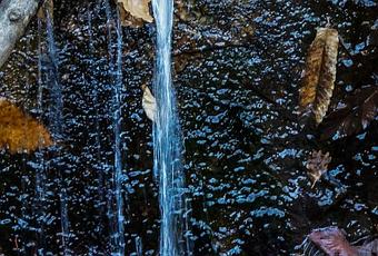 Cuando estuve allí había un joven llenando bidones de agua de la fuente y cargándolos en un coche, así que mientras acababa me acerqué al río a echar unas fotos de la corriente. Resulta curioso ver cómo se apilan las hojas de los árboles contra las piedras del río empujadas por la corriente.