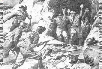 Una escena épica de la batalla de Amba Alagi: Bersaglieri italianos capturan a un grupo de soldados británicos agazapados en las montañas.Camaradas,