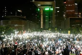 La foto es de Hong Kong, la antigua colonia británica. Es curioso que mientras el ser humano está viviendo una época muy buen bienestar social a todos los niveles, no podemos decir lo mismo de las libertades. Los mediocres dirigentes que hemos votado nos tienen mucho miedo y nos tienen que atar en corto constantemente. Los que nos siguen desde hace tiempo ya saben que las fotos que mas nos gustan son las de las manifestaciones. ( La foto del año y un villancico ). A nosotros nos gusta mucho ver las distintas formas que tienen los pueblos oprimidos de manifestarse. Vemos como hemos pasado de la hoz, el pico, la pala y las antorchas a otro tipo de símbolos, las manos, flores, colores, primaveras ... En esta época de alta tecnología las armas para manifestarse son otras como los teléfonos móviles. En esta foto podemos ver a cientos de manifestantes usar el arma que mas temen nuestros dirigentes. Esa arma no es una pistola, una hoz, un martillo, un pico... A Esteban y a mi nos llama la atención que el arma que en estos momentos mas temen los dirigentes chinos es la luz que emiten por la noche los teléfonos móviles.