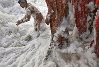 Así que eso es un río, ¡toda esa espuma es contaminación!. Pero mira por donde, una tradición es una tradición y si la tradición dice que hay que ir al río a purificarse, pues se va y ya está, este chico igual se purifica pero va a durar tres días.
