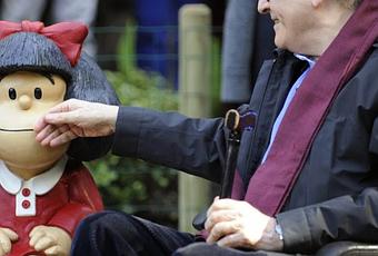 Pocas veces el personaje supera a su autor. Aquí tenemos a Quino y a Mafalda. Por Mafalda no pasan los años, sigue igual que siempre, por Quino si. El autor de la foto le da mas importancia al personaje. Por eso lo muestra de frente y a Quino de perfil y es una pena, por que nos gustaría ver la cara de Quino. Lo que si que vemos es su mano acariciando a Mafalda, es que los protagonistas de la foto no son ninguno de los dos. El protagonista es la mano, la caricia. La caricia que sólo es capaz de dar alguien que quiere con locura a otro ser del planeta Tierra. Una caricia llena de ternura. Por cierto se han fijado que ese perfil que vemos de Quino es el mismo con el que dibuja a los personajes de sus tiras.