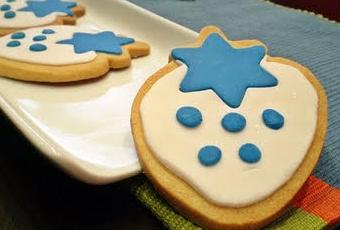 Y como no, la brujita tenía que poner su toque en todo esto, asi que le he preparado unas galletas con su logo (bueno lo más parecido posible) y aqui os dejo con las galletas de vainilla decoradas fresa azul