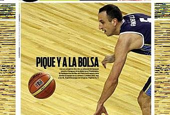 Me gusta esta tapa porque tiene tensión, la pelota a punto de picar, Manu listo para el contragolpe y el juego de palabras usado para transmitir que el partido fue fácil: Pique (palo) y a la bolsa.