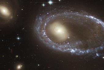 ¿Cómo puede una galaxia adoptar la forma de anillo? El borde de la galaxia azul de la fotografía es una enorme estructura en forma de anillo de unos 150.000 años luz de diámetro compuesta por estrellas masivas muy brillantes recientemente formadas. Esta galaxia, AM 0644-741, es conocida como una galaxia anular y es el resultado de una inmensa colisión de galaxias. Cuando las galaxias chocan, pasan una a través de la otra, pero las estrellas individuales raramente se ponen en contacto. La forma de anillo es consecuencia de la perturbación gravitatoria causada por una galaxia intrusa pequeña que atraviesa una grande. Cuando esto ocurre, el gas y el polvo interestelares se condensan y causan una ola de formación estelar que se desplaza desde el punto de impacto como una onda sobre la superficie de un estanque. La galaxia intrusa está justo más allá de la fotografía tomada por el Telescopio Espacial Hubble. Esta imagen ha sido seleccionada para conmemorar el aniversario del lanzamiento de Hubble de 1990. La galaxia anular 0644-741 se encuentra a unos 300 millones de años luz de distancia.