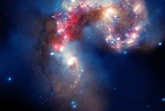 Nueva toma del centro de la galaxia de las Antenas (NGC 4038/4039), a 62 millones de años luz de distancia, y que corresponde a dos galaxias en colisión (lo que muestra la imagen es justo el centro del sistema) de la que salen dos prominentes colas de marea (de ahí el nombre de Antenas). Esta image está conseguida combinando datos de los Grandes Observatorios de NASA: rayos-X con Chandra (azul), óptico con el HST (amarillo y marrón) e infrarrojo con Spitzer (en rojo). Más información, en las nota de prensa del HST y NASA. Crédito de la imagen: Chandra: NASA/CXC/SAO, Spitzer: NASA/JPL-Caltech, Hubble: NASA/STScI.