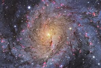 Lo primero que pensamos al ver ésta galaxia es en la intensidad de sus colores, por eso ha sido bautizada como la Galaxia de los Fuegos Artificiales. La imagen ha sido tomada con el instrumento OSIRIS del Gan Telescopio de Canarias. Catalogada como NGC 6946, es una galaxia espiral situada a unos 10 millones de años luz de distancia de la Tierra y ubicada en la zona del cielo que limita las constelaciones de Cepheus y el Cisne. Fue vista por primera vez por William Herschel en 1798. También es una de las galaxias espirales gigantes más cercanas al grupo local. NGC 6946 tiene una estructura en espiral con múltiples y peculiares brazos que se unen finalmente en cuatro brazos espirales dominantes. El diámetro de la galaxia es de aaproximadamente 40.000 años luz ó un tercio del tamaño de la Vía Láctea. Desde nuestro punto de vista en la Vía Láctea, vemos NGC 6946 de cara. La galaxia está muy oscurecida por el material interestelar de la Vía Láctea, ya que está bastante cerca del plano de nuestra galaxia.