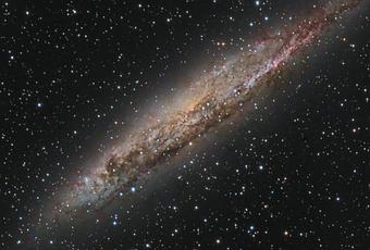 En esta fotografía cósmica se ve la gran galaxia espiral NGC 4945 de canto. La nítida imagen telescópica muestra el disco de polvo, los cúmulos de jóvenes estrellas azules y las regiones de formación estelar rosadas. NGC 4945 es casi tan grande como la Vía Láctea. A unos 13 millones de años luz de distancia en la extensa constelación austral de Centaurus, está tan sólo unas seis veces más lejos que Andrómeda, la gran galaxia espiral más cercana a la Vía Láctea.