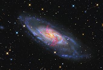 La M106 es una galaxia espiral situada en la constelación de Canes Venatici y fue descubierta por el astrónomo francés Pierre Méchain en 1781. Tiene un tamaño de 30.000 años luz de diámetro y esta a una distancia de 21 millones de años luz más allá de las estrellas de la Vía Láctea. En la imagen podemos ver, ademas del brillante nucleo central, los jóvenes cúmulos de estrellas en azul y guarderías estelares de color rojizo, también se aprecian enormes chorros de de hidrógeno de color rojo.