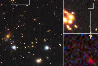 Imagino que ya la habrán visto por las noticias, pero si no es ese el caso, aquí tienen la fotografía que se ha obtenido juntando datos del telescopio espacial Hubble y el Spitzer. Ese punto rojo es la galaxia más lejana que se ha detectado hasta la fecha. La luz proveniente de esa galaxia ha viajado unos 13.200 millones de años luz, que se dice pronto. Para mí, es imposible imaginar semejante distancia.