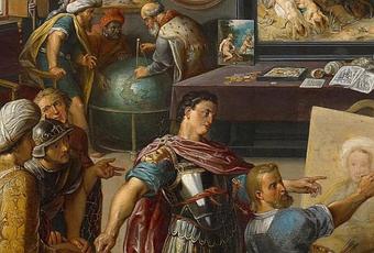 La escena principal muestra al pintor Apeles con su modelo la bella Campespe, concubina de Alejandro Magno que observa. Se trata de un puro artificio para exhibir una rica colección de pinturas en perspectiva. En muchos gabinetes o galerías de mercante encontramos una escena matemática: los astrónomos geógrafos sobre un globo terráqueo o celeste desarrollando su actividad. La presencia de tres matemáticos tiene por objetivo poner de manifiesto la deuda con Ptolomeo y los árabes: los modernos dialogando con sus maestros antiguos.