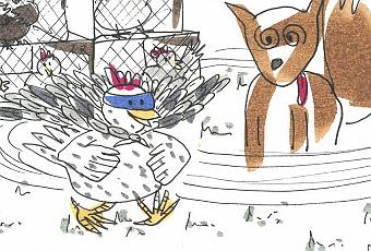 Y tranquilas como cualquier noche de verano, se fueron a dormir. Hasta que el perro del granjero vino con ganas de jugar y empezó a ladrarles y a intentar arrancarles alguna pluma. Y entonces todas miraron de nuevo a la gallina mayor, quien se dispuso a salvarles y de un brinco se acercó al perro y empezó a darle picotazos hasta que huyó dolorido.