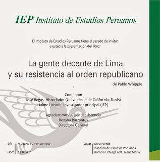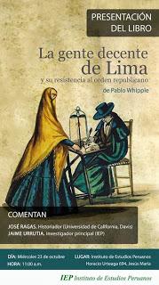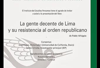 El Instituto de Estudios Peruanos tiene el agrado de invitar a usted a la presentación del libro "La gente decente de Lima y su resistencia al orden republicano” de Pablo Whipple. Se llevará a cabo el miércoles 23 de octubre, a las 11:00 a.m., en la sede principal del IEP (Av. Horacio Urteaga 694, Jesús María).