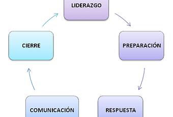 Para poder conocer en profundidad cómo se gestiona una cibercrisis debemos plantearnos 5 fases de diferentes alcances: liderazgo, preparación, respuesta, comunicación y cierre. Estas áreas tienen una presencia cíclica, tal y como se presenta en el siguiente esquema.