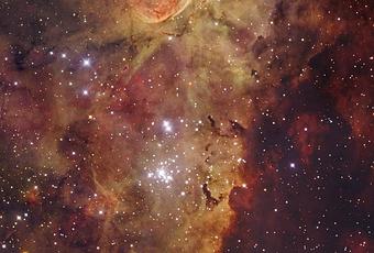 Un fotogénico mosaico de la brillante Vía Láctea austral, que posee una de las estrellas más enigmáticas y exóticas conocidas. Eta Carinae, es la pieza central y la estrella ionizante de la gran región HII Eta Carinae. La nube molecular mide unos 260 años luz de diámetro, aproximadamente 7 veces el tamaño de la nebulosa de Orión. Masiva es un eufemismo, ya que la gran estrella pesa alrededor de 100 a 150 masas solares y brilla con la luz de 5 millones de soles. Como una de las estrellas más masivas conocidas, Eta Carinae se aceca a los límites teóricos sobre la producción de energía de las estrellas y ha atraído mucho interés entre los astrónomos tratando de comprender la física de las estrellas supermasivas. La estrella supergigante joven, tiene una edad de entre sólo 2 a 3 millones de años, bombea tanta energía en 6 segundos como el Sol lo hace en un año entero. Su prodigioso viento estelar descarga la masa equivalente a Júpiter cada año, superando en 100 mil millones la tasa anual de pérdida de masa de nustro Sol.