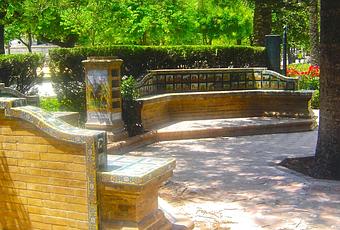 Finalmente, en la Plaza de América podemos pararnos sobre los bancos que rodean la Glorieta de Cervantes, un lugar privilegiado del que vamos a hablar en el día de hoy y en los próximos para mostrarles el valor artístico y literario de los azulejos allí colocados que resumen gráficamente la historia de Don Quijote de la Mancha.