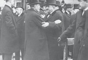 Pd.: En la primera foto, Cambó abraza a Romanones. No he conseguido encontrar la fecha, a juzgar por las canas de ambos, es posterior a la Gran Guerra. La caricatura de Bagaría se publicó en la revista ‘España’ el 6 de marzo de 1920. Como cuentan en el blog Kaffekantante, ‘recuerda’ al posterior ‘Tiempos Modernos’ de Chaplin. Atentos al cartel de ‘San Tirpitz’, una referencia al almirante que mandaba la flota alemana durante la IGM. La foto de portada muestra la detención de un manifestante durante las protestas de la huelga general de agosto de 1917.