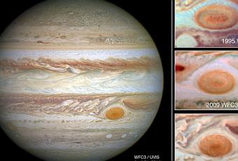 La característica mancha de Júpiter, la gran mancha roja, que se trata de una gran tormenta en forma de remolino de un tamaño superior a la Tierra, se está reduciendo. Esta gran mancha conocida desde la década de 1930 está cambiando su forma ovalada a otras más circular según estas nuevas y sorprendentes imágenes del telescopio Hubble, que muestran las diferentes dimensiones de esta mancha tomadas en 1995, 2005 y en 2014, y que ha disminuido en varios miles de kilómetros.