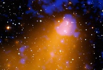 Dos equipos diferentes han confirmado el uso de Chandra para las observaciones de cúmulos de galaxias con el fin de estudiar las propiedades de la gravedad a escalas cósmicas y poner a prueba la teoría de la relatividad general de Einstein. Este tipo de estudios son cruciales para la comprensión de la evolución del universo, tanto en el pasado y el futuro, y para sondear la naturaleza de la energía oscura, uno de los mayores misterios de la ciencia. Esta imagen compuesta del cúmulo de galaxias Abell 3376 muestra datos de rayos X a partir de la una imagen de radio del VLA, el Observatorio Chandra de rayos X y el telescopio ROSAT en color oro, una imagen óptica de la Investigación Digitized Sky combinando el rojo, el verde y el azul. El aspecto resultante de los datos de rayos X es causado por una fusión, y ver cómo el material fluye en el cúmulo de galaxias desde la banda derecha. Los arcos de radio gigantes en la parte izquierda de la imagen pueden ser causados por ondas de choque generadas por esta fusión.