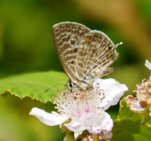 La gris estriada es una especie inconfundible, sobre todo en su parte inferior, con esos dos llamativos ocelos verdeazulados con un gran punto negro en su centro y bordeados de anaranjado. Es apreciable un fuerte estriado, que le da nombre. Por arriba la hembra es de tonos marrones, con una amplia difusión azul, como pude comprobar cuando finalizó la puesta de los huevos y desplegó sus alas dispuesta para irse.