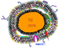 En esta imagen esquemática puedes ver el corte transversal de un glóbulo graso como los que contienen la grasa de la leche. Durante la operación de batido se provocan daños en la membrana de fosfolípidos que rodea el glóbulo, permitiendo la salida al exterior de los triglicéridos contenidos en el centro. (Fuente)