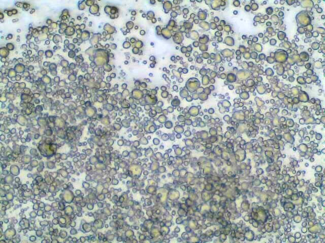 Microfotografía (600 aumentos) de una emulsión en la que se puede apreciar la fase dispersa (glóbulos amarillentos) y la fase continua (el fondo azulado). (Fuente)
