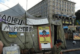 Campamento en la plaza del Maidán de Kiev a principios de julio de 2014. En el escudo se puede leer en ucraniano “el Donbás es Ucrania”. El cartel con la bandera rusa dice: “No necesitamos su ayuda”. También se leen los nombres de las ciudades de Donetsk, Mariúpol y Kramatorsk, todas en la región del Donbás. Fotografía original del autor.