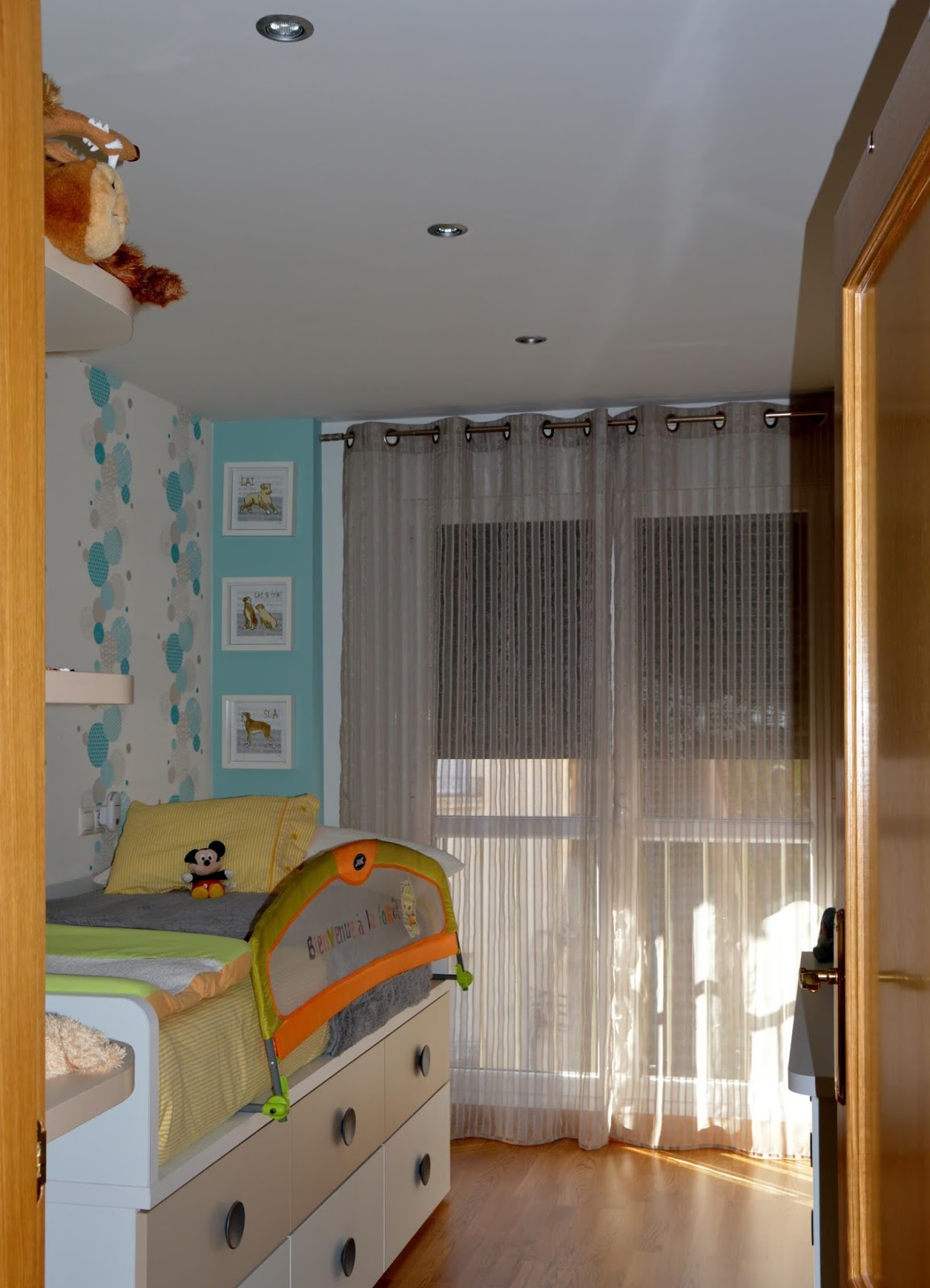 - LA HABITACIÓN DE ÁLEX - PARTE 3: LOS CUADROS- LA HABITACIÓN DE ÁLEX - PARTE 4: LETRAS SCRABBLEPincha sobre cada título y accede al post correspondiente.Hoy, sólo quería mostrar el resultado final, cómo es actualmente la habitación de nuestro pequeño.Como ya comenté, directamente dispusimos una habitación juvenil.Álex durmió con nosotros, en su cuna, hasta los tres meses.La verdad es que no podemos quejarnos, en tres-cuatro meses empezó a hacer la noche completapor lo que lo movimos a su habitación rápido.