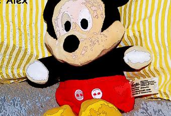 Por supuesto en su cama no puede faltar Mickey Mouse.Le gusta mucho ;)