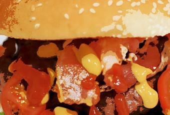 En lugar de tomates, que los que tenía en casa no tienen demasiado sabor, puse (haciendo equilibrios) unos tomatitos cherry cortados en rodajas, y después, sobre la hamburguesa que ya parecía una pirámide, eché unos chorritos, (pequeños) de tomate ketchup y mostaza, que uno es un clásico. Colocar la tapa y a la mesa, procurando no mancharnos mucho. Y como quería medalla de oro, hice también unas patatas fritas de sartén, el mejor complemento.