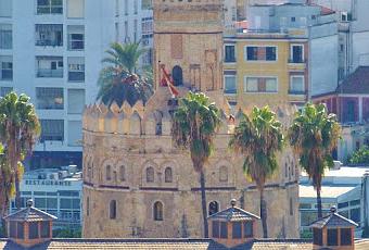 Desde la Giralda también podemos apreciar la esbelta y rechoncha figura de la Torre del Oro. Los reflejos áureos de esta torre albarrana aún pueden adivinarse. Su especial mezcla de mortero, cal y paja prensada le dio, hace siglos, unos reflejos dorados sobre el rio que sirvió para que se le diera el nombre por el que la conocemos en la actualidad.