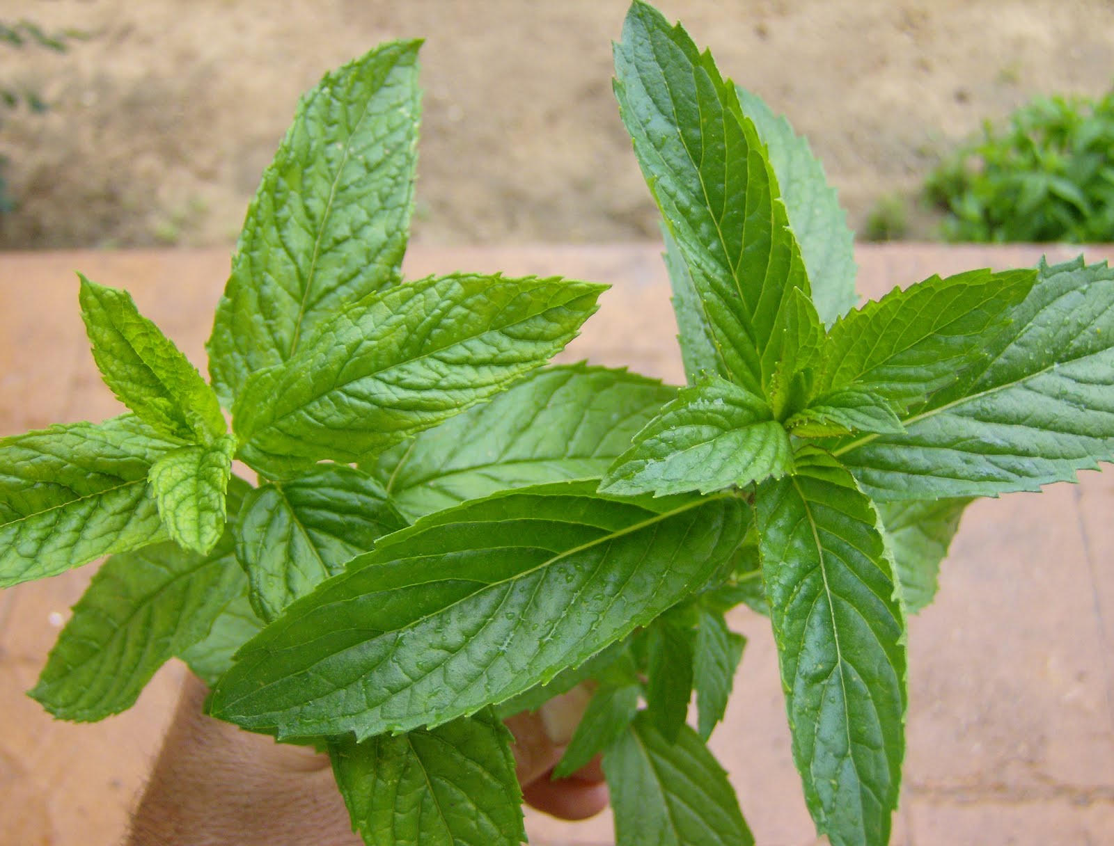Otra de mis Aromáticas, es la MENTA, cuyo nombre botánico es mentha spicata y perteneciendo a la familia de las lamiaceae, es una planta muy parecida a la anteriormente descrita en todas sus características, quizás su color sea un poco intenso, con hojas ligeramente mas vigorosas y el tallo central tiende a tener un color rojizo. Pero la característica principal que la puede distinguir de la hierbabuena es su olor, que lógicamente son totalmente distinto. Como se puede observar en la siguiente foto.A la izquierda: Hierbabuena, a la derecha: Menta,