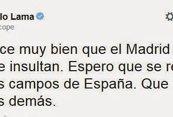 Me había mandado Julio Francisco al correo para su publicación el tuit de Manolo Lama dondea poyaba la decisión del Real Madrid de expulsar a los que insultan al rival en el estadio e instaba a los demás clubes a hacer lo mismo y el vídeo donde este mismo señor insulta a Arbeloa, pero he querido añadirle unos pocos más de episodios donde se demuestra, una vez más, la hipocresía de este señor. Y espero que se cumpla su deseo: Qué no dejen entrar en los estadios a los que insultan, pero ... ¡qué empiecen por él!