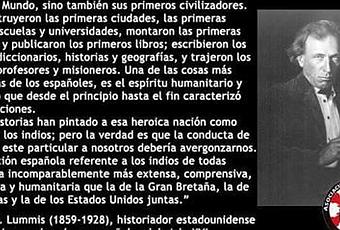 El de Lummis es uno de los pocos reconocimientos mundiales de la gran mentira sobre España, escrita, difundida e impuesta como verdad en todo el mundo por cientos de estudiosos y propagandistas extranjeros, sobre todo anglosajones. La versión que ellos han difundido con éxito de la Historia de España es una inmensa sarta de mentiras que ensucian una historia que, aunque tuvo errores y carencias, es para sentir mucho orgullo ante ella y que posee mucha mas dignidad, justicia y civilización que la opresiva y cruel historia de muchos países en sus etapas de poder, entre ellas las de Gran Bretaña y Estados Unidos, dos de los países mas crueles, imperialistas y masacradores del planeta.