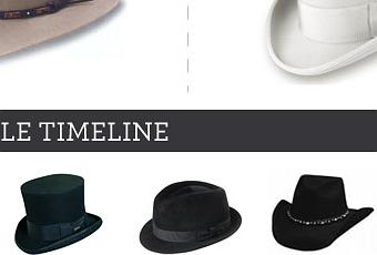 En la imagen vemos una clasificación de los sombreros, dependiendo de su forma y de su copa, y que añade además una interesante línea del tiempo en la que nos muestra la fecha de aparición de cada uno de los modelos más representativos de la historia del sombrero para caballero.