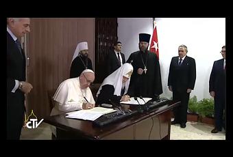 1. Por la voluntad de Dios Padre, de quien procede todo don, en el nombre de Nuestro Señor Jesucristo, con la ayuda del Espíritu Santo Consolador, nosotros, Francisco, Papa y Obispo de Roma, y Kiril, Patriarca de Moscú y Toda Rusia, reunimos hoy en La Habana. Damos gracias a Dios, glorificado en la Santísima Trinidad, por este encuentro, el primero en la historia.