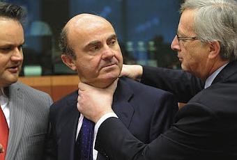 La imagen de ayer, que preside esta entrada, en la que Jean-Claude Junker, presidente de la reunión del Eurogrupo, simula estrangular al ministro Luis de Guindos, nuestro ministro de Economía, no puede ser más significativa y es que al final de la reunión, los responsables de Economía y Finanzas de la UE le han dicho que deberá reducir el déficit al 5,3 y no al 5,8 como había anunciado Rajoy. Eso supone una reducción adicional de 5.000 millones de euros, lo que elevará la cifra de reducción a 35.000 millones de euros. Ahora comprendemos que este simulacro de estrangulamiento era premonitorio de lo que iban a decidir después.