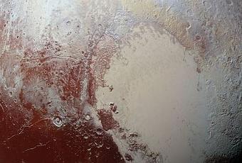La imagen combina imágenes azules, rojas e infrarrojas tomadas por el instrumento Ralph/Multispectral Visual Imaging Camera (MVIC). La superficie de Plutón luce con una extraordinaria gama de colores muy sutiles. Se pueden apreciar una gran cantidad de detalles que revelan la enorme complejidad de la historia geológica y climatológica del planeta enano Plutón y que tanto está sorprendiendo a los científicos. La imagen resuelve detalles y colores en escalas tan pequeñas como 1,3 kilómetros!!