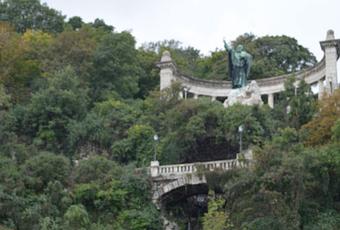 Caminando hacia ella por la orilla oeste del río encontramos la Fuente Gellért, donde una estatua del Obispo Gellért mira hacia la ciudad con una cruz en la mano.