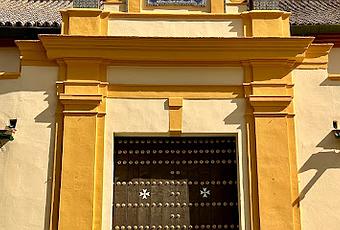 En la parte superior de la puerta se añadió un cuerpo en forma de espadaña en el que podemos ver una panel cerámico con la siguiente lectura: