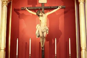 Curiosamente, durante los años en que San Román permaneció cerrado por su restauración, este Cristo, del que no consta que nunca haya sido titular de ninguna cofradía, recibió culto en Santa Catalina, junto al retablo de Santa Lucía.Podemos ver al Cristo de la Misericordia y Reconciliación ante un retablo con fondo rojo y cuya parte superior, de forma curva y con crestería y pináculos, está sostenida en los laterales por dos columnas de fuste acanalado y capitel de estilo corintio. Además, arriba en el centro está pintado en rojo el emblema JHS. Las columnas que lo flanquean se apoyan en pies con decoración eucarística.Sigue leyendo >>>