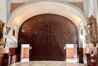 La entrada principal del templo se encuentra a los pies del mismo. Tras la puerta exterior nos encontramos un pequeño vestíbulo y una cancela de madera que permite el paso al interior de la iglesia a través de unas pequeñas puertas auxiliares y dos portones centrales enormes que normalmente están cerrados.