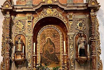 En el ático del retablo se encuentra un lienzo de la Anunciación. A ambos lados de la Virgen de la Cinta encontramos dos tallas, San Wenceslao de Kostka a su izquierda y San Nicolás a su derecha.