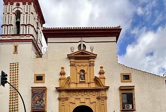 La portada principal de la iglesia de San Roque se encuentra en la plaza de Carmen Benítez. En el centro del muro se encuentra la puerta, enmarcada por composición de estilo neoclásico de dos cuerpos.