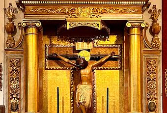El Cristo de San Agustín procesionó en sus últimos años, una vez por década, siendo la última realizada en 1926. Anteriormente estuvo procesionando en Miércoles Santo, hasta 1896. El actual Crucificado es obra de Agustín Sánchez Cid (1944), réplica del desaparecido en el incendio de 1.936, que databa de la primera mitad del siglo XIV. Desde 1990 la Hermandad de San Roque tiene concedido el título y la advocación del Santo Crucifijo de San Agustín, por parte de la Vicaría General.