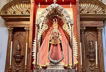 A ambos lados del retablo podemos ver al Niño Jesús de Praga y al Arcángel San Rafael. En la foto de arriba podemos ver a la Virgen en el altar de la iglesia de San Roque para presidir los cultos que se realizan en su nombre a finales de octubre.