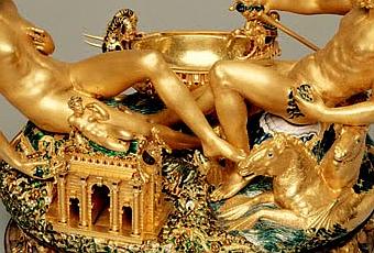 (Imagen de la obra El Saliero, de Benvenuto Cellini, Museo de Arte de Viena, robada en el año 2003 de este museo por un ladrón amateur, que lo organizó sin embargo para solicitar un rescate a la compañía de seguros, la policía vienesa logró detenerlo y recuperar la pieza de arte, valorada en 50 millones de euros, tres años después; Imagen de un salero real y convencional, con el mismo uso que la obra creada, pero sin su exquisita mentira; Grabado con la imagen de Oscar Wilde; Busto de Benvenuto Cellini en Florencia).