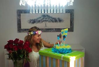 Y para Esther, elegimos un marca páginas de plata, grabado con el nombre de todos los peques, el nombre de la clase y el periodo escolar., además ya que Ester espera a su primer bebé y los peques han vivido todo ese proceso, han ayudado con mucha ilusión en la elección del nombre del bebé y han estado en todo momento al tanto y pendientes de esa tripita, acompañamos el detalle con una tarta de pañales, un pequeño lote de artículos para el cuidado del bebé, un globo transparente que sirvió de relleno para la enorme caja y un ramo de rosas.