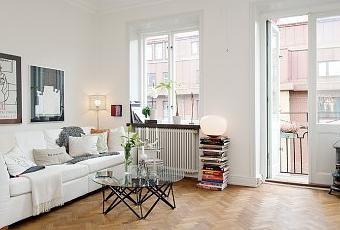 El piso que os enseño hoy (61m²), aunque simple en mobiliario, está lleno de cálidos, decorativos y prácticos detalles. Lo primero que salta a la vista, es el precioso suelo de parquet de espiga en el salón (ah! esos suelos) y en el pasillo, encontraste con las paredes y los muebles en blanco. Preciosas también las sillas CH24 de Hans Wegner para Carl Hansen en madera natural en el comedor y el práctico aparador hecho con lo que parecen ser 3 parejas de muebles de cocina. Rico en detalles es el papel de pared de William Morris & Co que han utilizado en la zona de trabajo habilitada en el pasillo y el de Marimekko en la cocina, donde también resalta la encimera de madera natural y el fondo de cemento lacado. No faltan soluciones de almacenaje en ningún rincón de la casa, como el acogedor banco del pasillo. ¿No os parece un apartamento muy cálido?